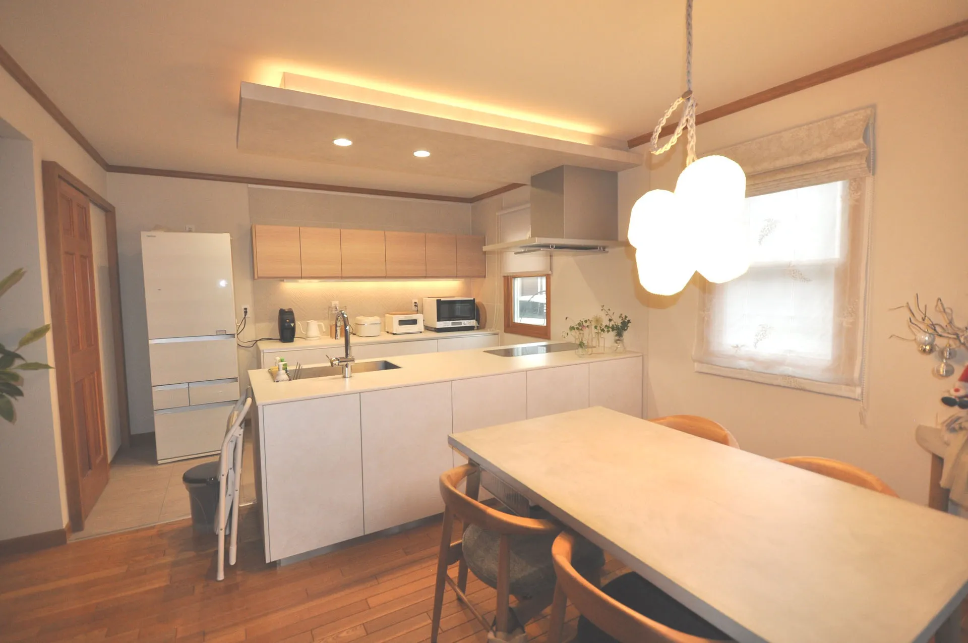 オープンプランだった空間は、空調効率を高める間取りへと変更。子世帯の好みに合わせて、北欧風インテリアで統一し、シンプルモダンなキッチンへと刷新しました。