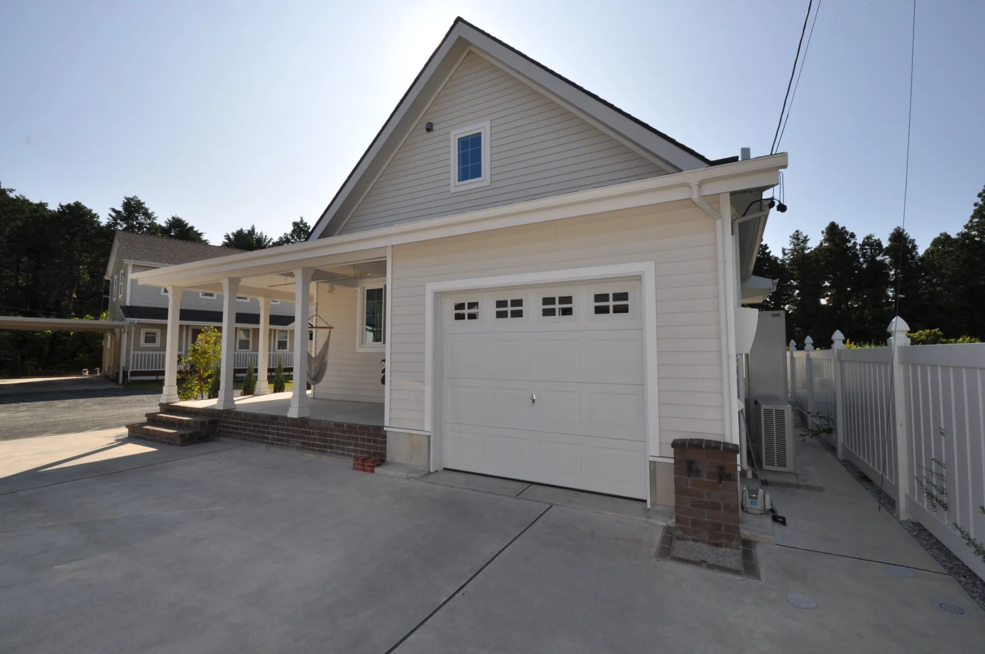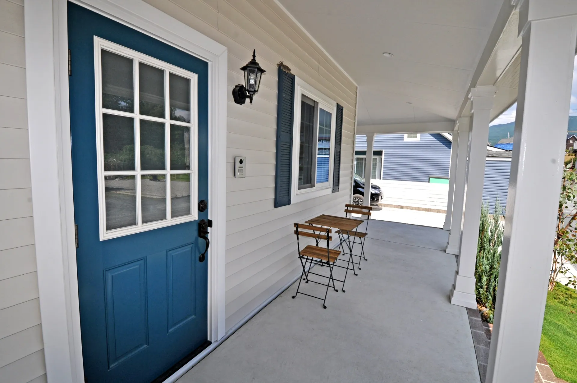 外観は、板張り風のラップサイディング、ドーマー付きの切妻屋根、連続した柱が支えるカバードポーチなど、リズミカルで温かみのある意匠を採用。